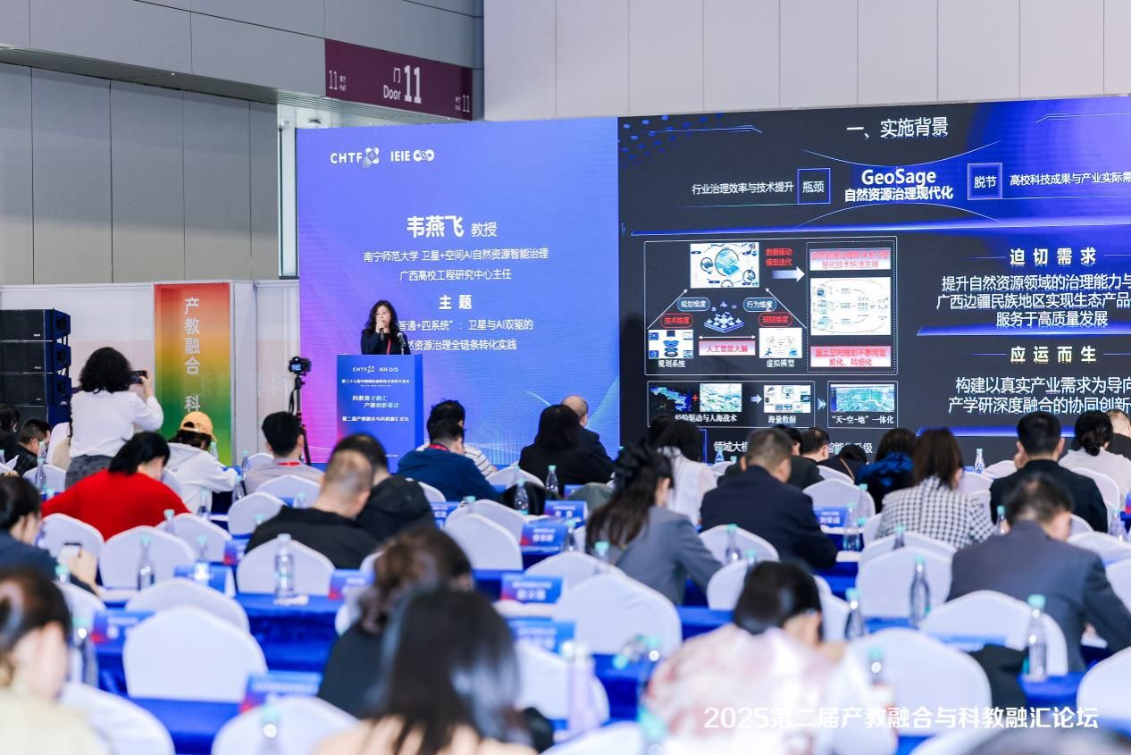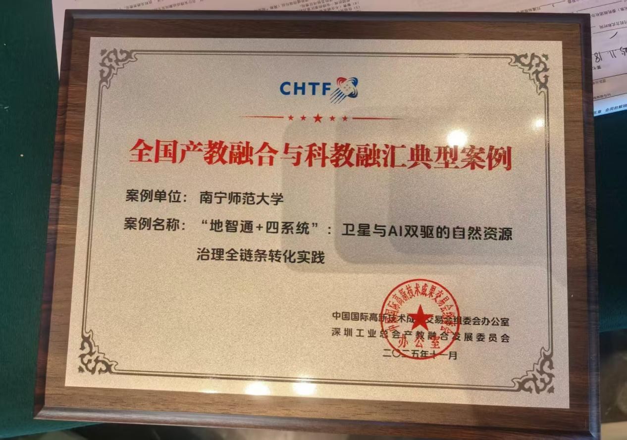 2025年11月14日,南宁师范大学参加了在深圳国际会展中心举办的“第二十七届中国国际高新技术成果交易会暨第二届产教融合与科教融汇论坛”。我校“卫星+”空间AI自然资源智能治理广西高校工程研究中心案例——“地智通+四系统”卫星与AI双驱的自然资源治理全链条转化实践,成功入选全国产教融合与科教融汇典型案例。
