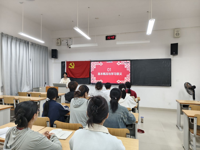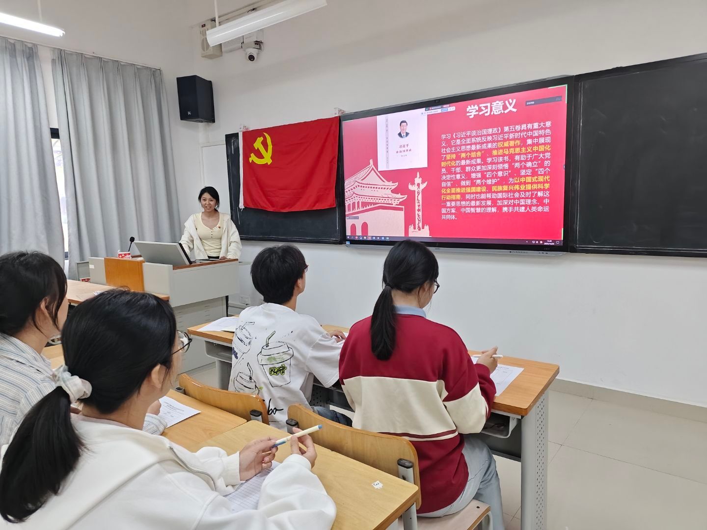 在党课学习中,鄢素红同志首先介绍,该书收录习近平总书记2022年5月至2024年12月的91篇著作,生动记录了习近平总书记领导党和人民应变局、开新局的伟大实践,集中展现了习近平新时代中国特色社会主义思想的最新成果,是系统学习党的创新理论的权威著作;随后,她解读了关于"第五卷与前四卷的区别",各卷次共同构成了系统科学的理论整体,一脉相承、与时俱进,全面反映了习近平新时代中国特色社会主义思想的发展脉络和完整体系;针对"大学生党员如何践行政治理论知识"的问题,鄢素红同志提出了加强理论学习、树立远大理想、培养实干精神、厚植为民情怀、提升斗争本领、践行绿色理念的六点要求。