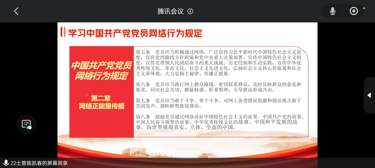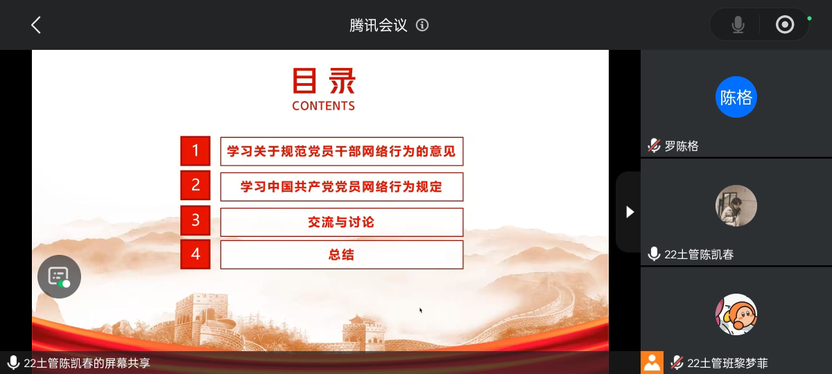 土管系本科生第一党支部于线上成功召开“加强文明上网,规范网络言行”主题党日活动,活动由陈凯春同志主持,党支部全体党员参加。